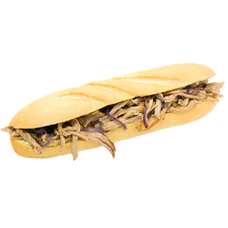 Bageta s trhaným masem maláSložení: pečivo, trhané vepřové maso, hořčicový dresing s dijonskou hořčicí, restovaná cibulka Výživové hodnoty ve 100g výrobku: Energie 1122kJ/266kcal, tuky 14g z toho nasycené mastné kyseliny 2,7g, Sacharidy 26g z toho cukry 3,2g, bílkoviny 8,9g,sůl 1,5g EAN: 589 402 507 5423 | |
