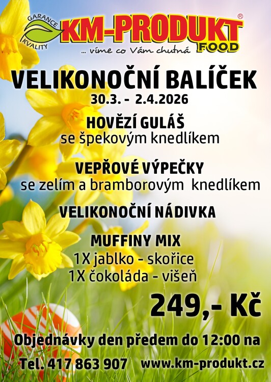 Velikonoční balíčekod 30.3. do 2.4.2026 nabízíme „VELIKONOČNÍ BALÍČEK“ 1ks HOVĚZÍ GULÁŠ se špekovým knedlíkem 1ks VEPŘOVÉ VÝPEČKY se zelím a bramborovým knedlíkem 1ks VELIKONOČNÍ NÁDIVKA 2ks MUFFIN MIX VŠE ZA CENU: 249 Kč Objednávat si můžete – telefonicky pracovní den předem do 12:00 hod. na čísle 417 863 907, nebo přes objednávkový formulář |